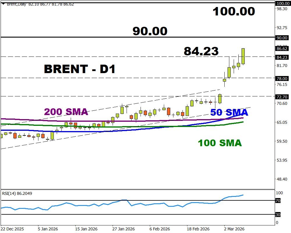 Global oil markets have been thrown into turmoil by the US and Israeli war against Iran. With shipping through the Strait of Hormuz effectively shut amid the conflict, this could push oil prices higher with any supply shocks driving Brent toward $90 and $100.