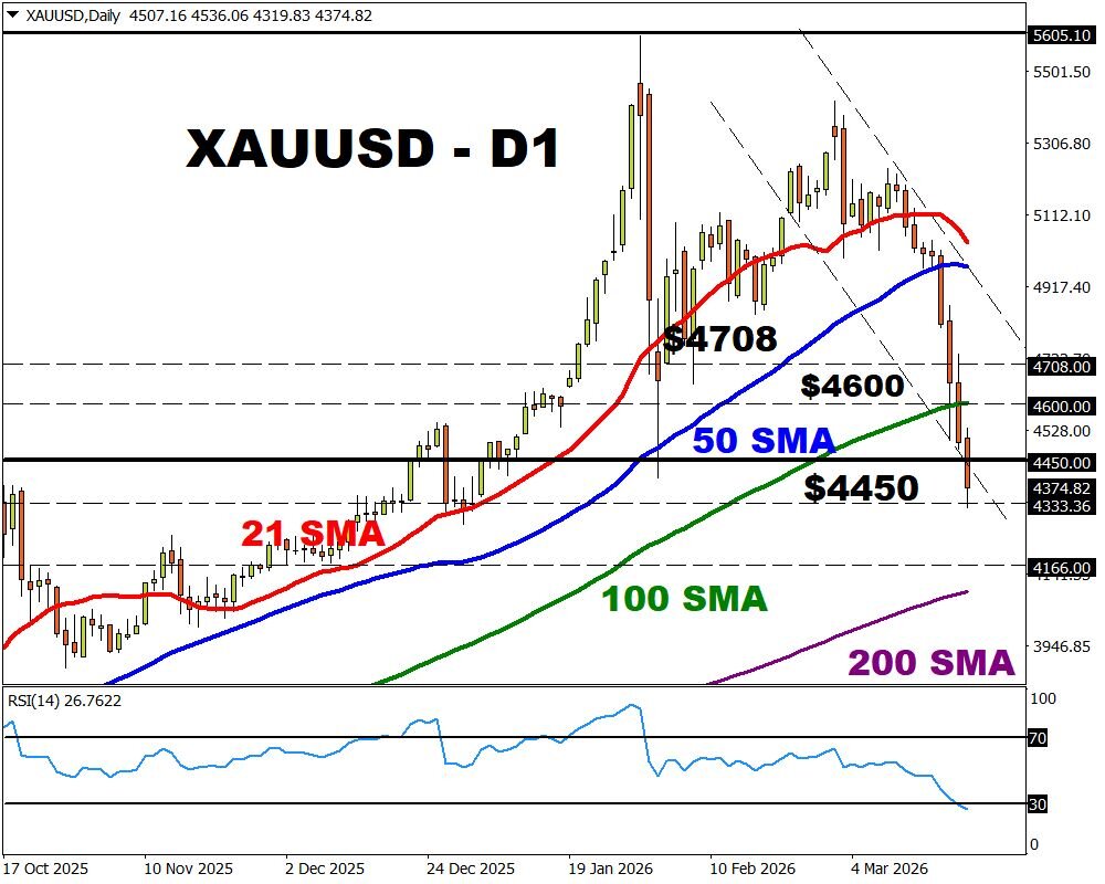 BULLISH – Should price push back above $4450, bulls may target the 100-day SMA at $4600.