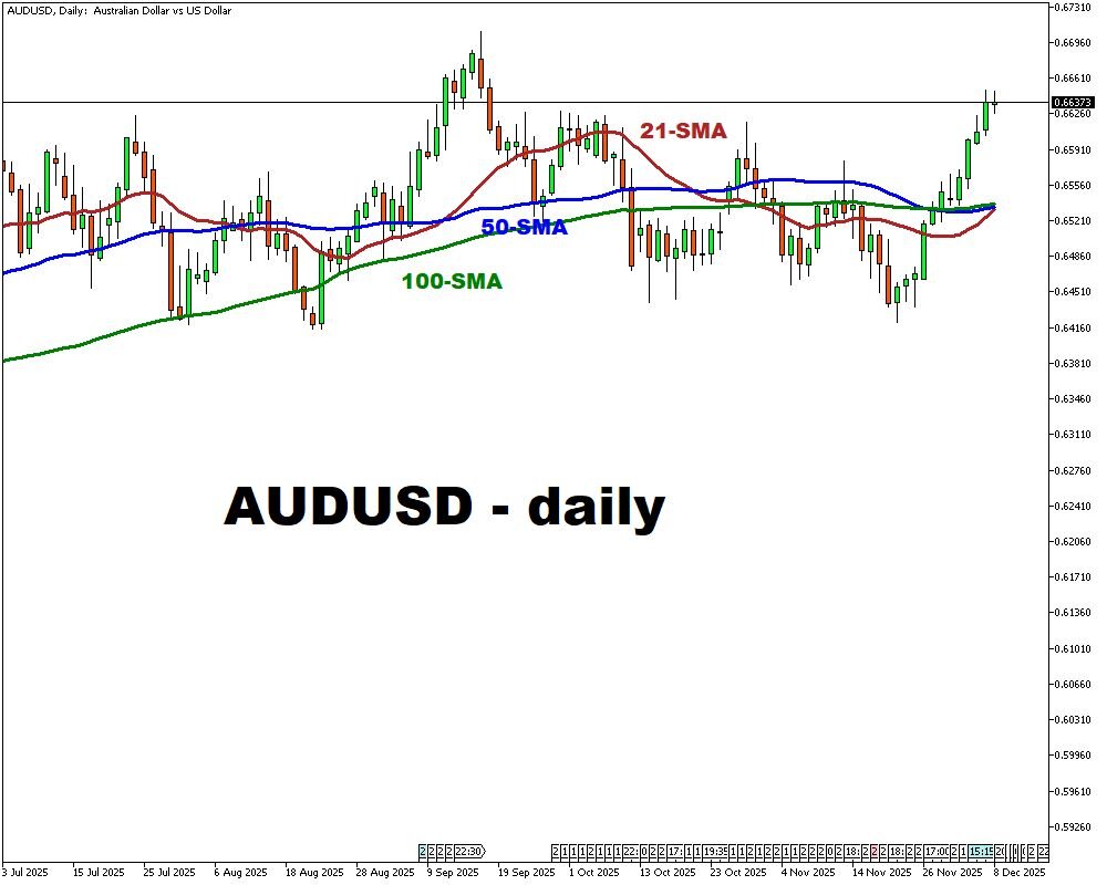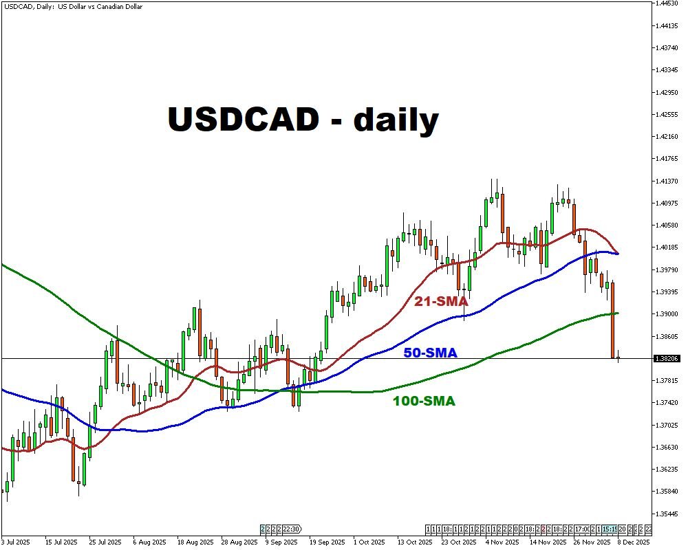 For AUDUSD, the RBA’s Dec. decision follows this year’s three rate cuts that lowered the cash rate to a still-slightly restrictive stance. For USDCAD, the Bank of Canada meets after its recent cut to 2.25%, with growth uneven and inflation nearer target but core measures still sticky, leaving policymakers cautious and unwilling to signal further easing.